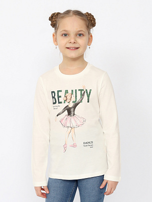 Джемпер для девочки, гладкоокрашенный, из трикотажа с эластаном. Рукав длинный, со сборкой по окату. Перед джемпера декорирован принтом. Нижний срез джемпера слегка присобран эластичной резинкой.