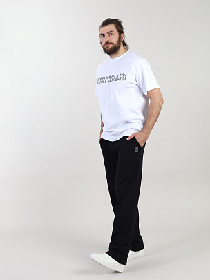 Брюки мужские прямые. Отрезной пояс выполнен из основного полотна. В поясе функциональный кругловязаный шнур вставлен в петли. Карманы наклонные с отрезным бочком. Декорированы жаккардовой этикеткой "продолжать".
