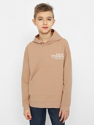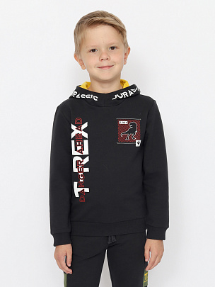 Толстовка для мальчика с капюшоном со шнурком, карман-кенгуру. Манжеты и пояс из эластичной рибаны. На рукаве декоративная силиконовая нашивка.