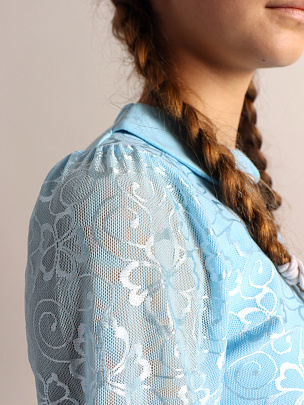 Джемпер для девочки с длинными рукавами и отложным воротником. Рукава из сетки с манжетами из кулирки. Полочка двойная - нижний слой из кулирки, верхний из сетки. Сзади застежка на пуговицу.
