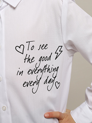Классическая блузка из хлопка, свободного силуэта с отложным воротником и длинными рукавами с манжетами. Застёжка центральная на планку с пуговицами, декорирована принтом ввиде надписей на полочках.
