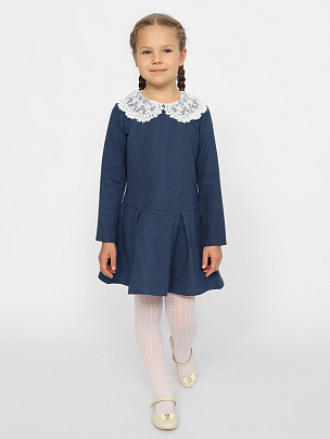 Платье для девочки из футера. Изделие с длинными рукавами, отложным съемным воротником из кружева. Отрезное чуть ниже линии талии. Сзади застегивается на пуговку. Декорировано бантиком.