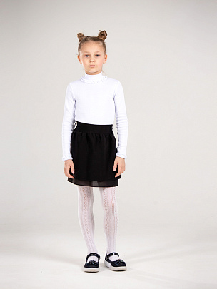 Джемпер для девочки с длинными рукавами и отложным воротником из кулирки, свободного силуэта. Рукава объемные, со спущенным плечом, снизу манжет из кулирки. Спинка с вырезом-капелькой и застёжкой на пуговицу-бусину с петлёй.