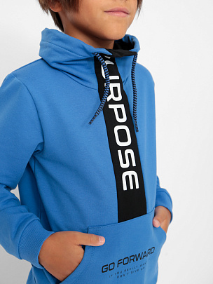 Толстовка с длинными рукавами и притачным поясом по низу. Манжеты и пояс выполнены из полотна с добавлением эластана. Перед с отрезной вставкой контрастноко цвета, которая переходит в воротник "Стойка". В нижней части переда расположен карман-кенгуру с декоративным принтом. Вставка переда декорирована принтом "ИДИ ВПЕРЕД. Брюки с притачным поясом и манжетами. В пояс вставлена резинка и функциональный шнур. Пояс и манжеты выполнены из полотна с эластаном.