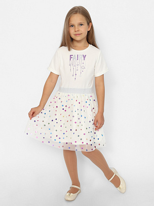 Нарядное платье прилегающего силуэта, с отрезной талией и короткими рукавами. На талии резинка с люрексом. Спереди блестящая шелкография. Верхний слой юбки из сетки с блестящими кружками. Верх платья, нижняя юбка из хлопкового полотна.