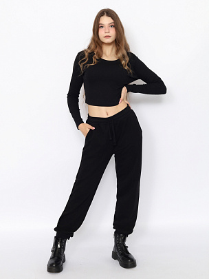 Свободные трикотажные брюки с карманами. В притачной пояс вставлена резинка и функциональный шнур. Нижние срезы брюк оформлены манжетами.